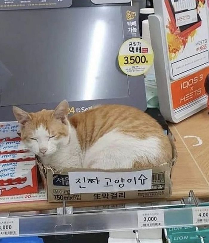 "자꾸 손님들이 고양이 인형인 줄 알고 만져봐서 이렇게 써 놨어요"